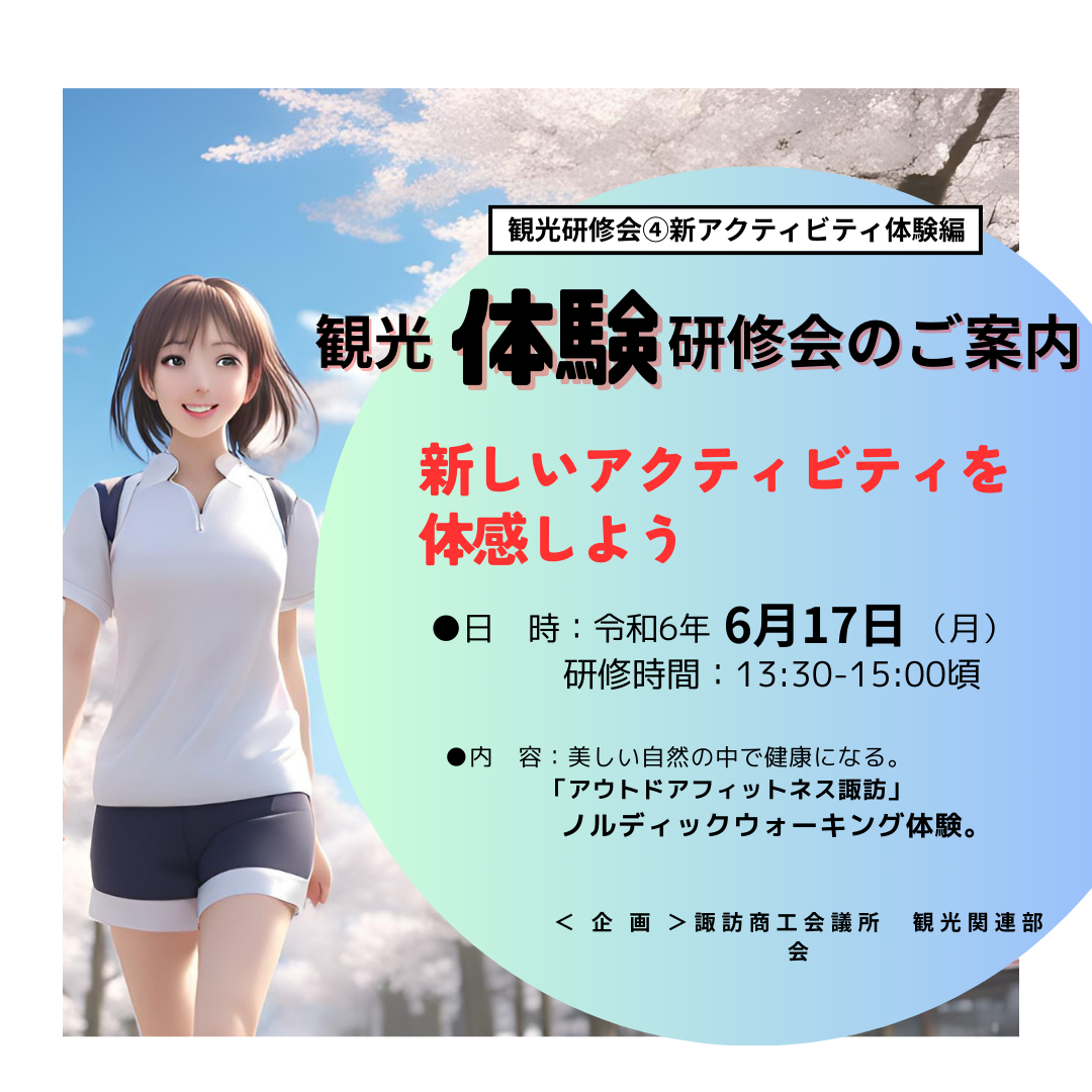 諏訪商工会議所観光関連部会では、市内で観光関連産業に従事する皆さんを対象とした(観光研修会)を企画しました。旅行者の気持ちになって研修することにポイントを置いて実施します。是非、ご参加ください。