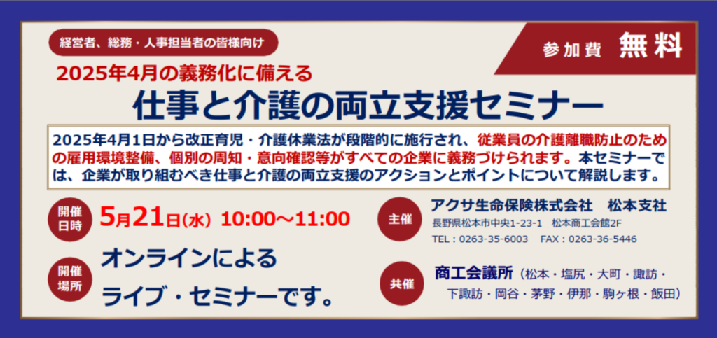 2025年4月1日から改正育児・介護休業法が段階的に施行されています。本セミナーでは企業が取り組むべき仕事と介護の両立支援のアクションとポイントについて解説します。