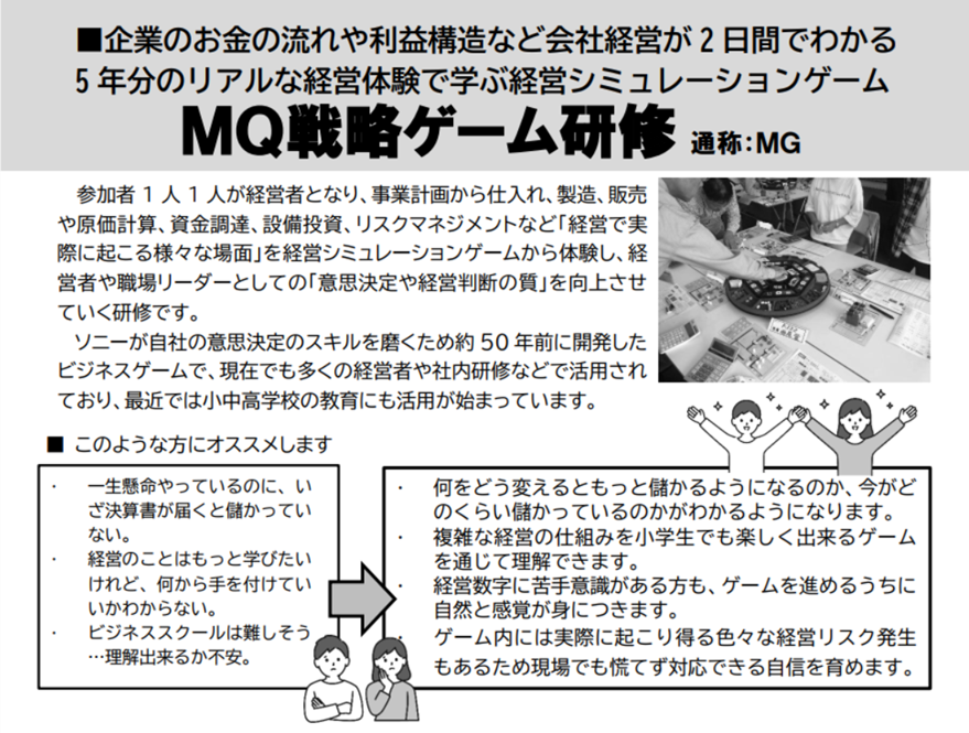 参加者1人1人が経営者となり、事業計画から仕入れ、製造、販売や原価計算、資金調達、設備投資、リスクマネジメントなど「経営で実際に起こる様々な場面」を経営シミュレーションゲームから体験し、経営者や職場リーダーとしての「意思決定や経営判断の質」を向上させていく研修です。