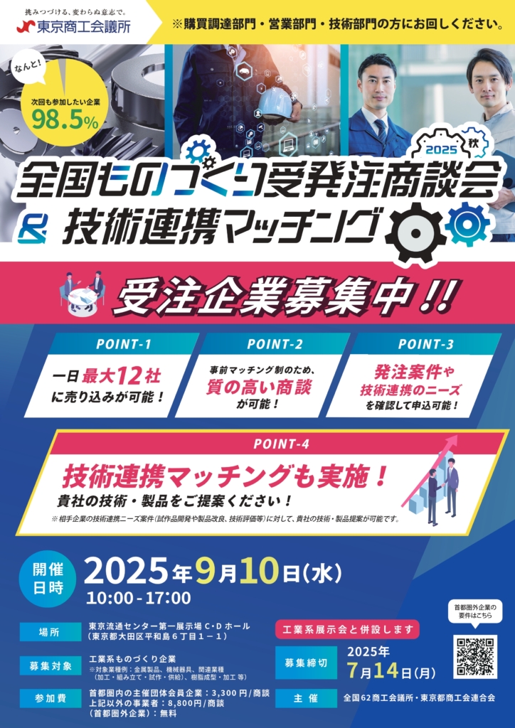 詳細内容 | ●受発注商談会 商談形式: 具体的な「発注案件」に対して受注側企業が商談を申し込みます。 発注企業から指名を受けると商談が組まれます。 ※商談をお申し込みをいただいても、発注企業から指名がない場合は当日の商談は組まれません。予めご留意ください。 商談時間:1商談25分。1日最大12商談。 特徴: ①アポイントが取りにくい発注企業に、1日で複数社売り込める! ②ミスマッチの少ない商談を実現!受発注双方の指名に基づき商談相手をマッチングします。 ●技術連携マッチング(企業間連携) 連 携 先:企業 連携可能な案件:主に製品開発、試作品開発、技術保有先の探索 商談形式:連携希望企業の「開発案件」を基に、技術連携可能な企業を募集する「完全事前マッチング制」 商談時間:1商談25分。1日最大12商談。 【お申込みから商談までの流れ】 ①下記「申込方法」をご参照いただき、本商談会へのお申込みを完了ください。 ※こちらの専用サイトから発注案件へのお申込みをもって、本申込の完了となります。 ②貴社情報を発注企業へ共有し、発注企業が当日商談を希望する受注企業を指名いたします。 発注企業から指名を受けた受注側企業に、当日の商談スケジュールをメールでご案内します。 ※発注企業からの指名がない場合には、当日の商談は組まれませんのでご留意ください。 ③商談会当日、通知したスケジュールに合わせて会場にお越し下さい。 |