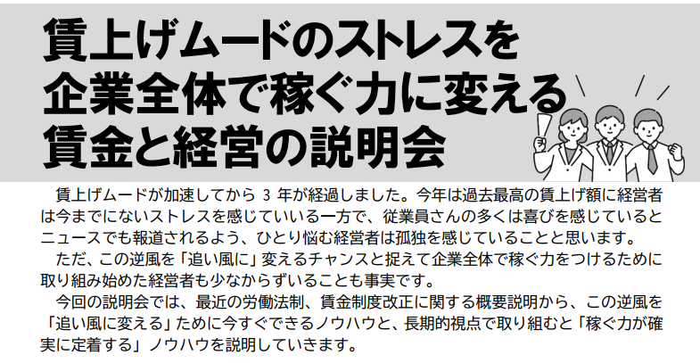 今回の説明会では、最近の労働法制、賃金制度改正に関する概要説明から、この逆風を「追い風に変える」ために今すぐできるノウハウと、長期的視点で取り組むと「稼ぐ力が確実に定着する」ノウハウを説明していきます。