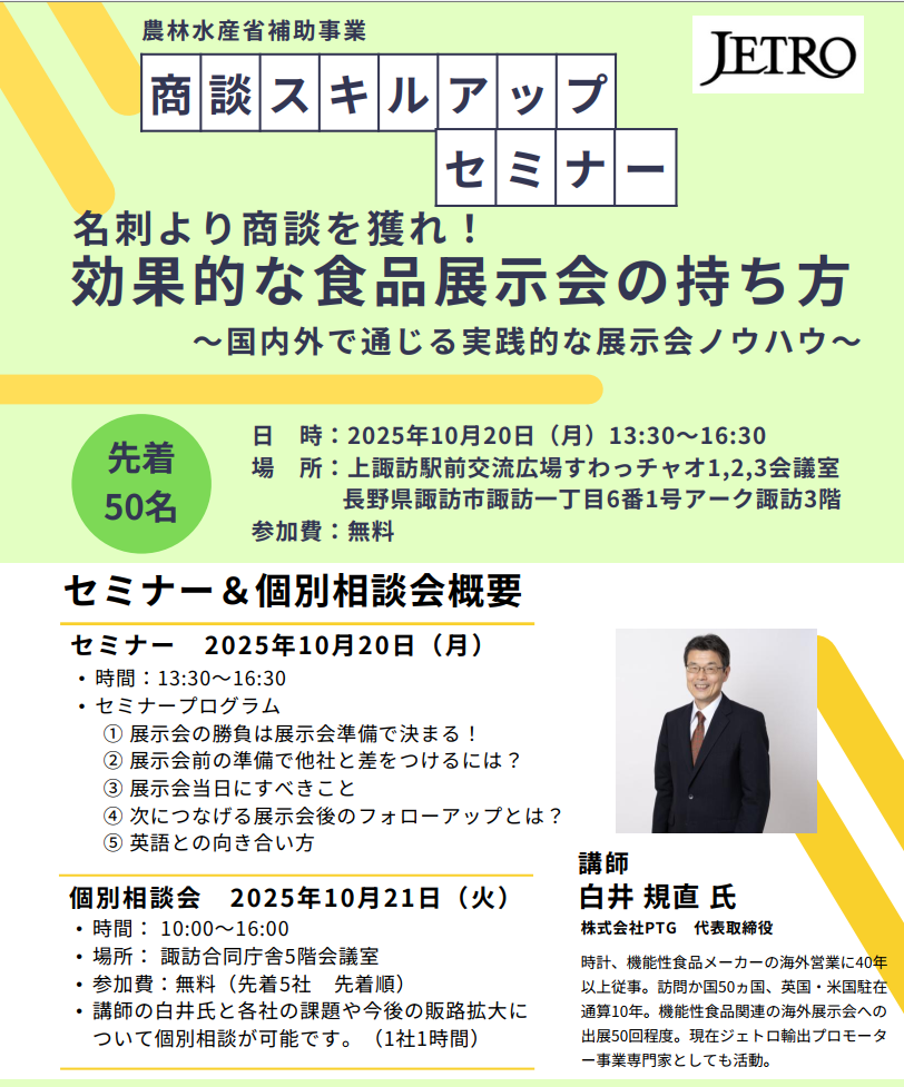 ジェトロが主催し、食品展示会で商談数を増やすノウハウを持ち帰れるセミナーを開催します。セミナーの翌日10月21日には個別相談会も実施します。