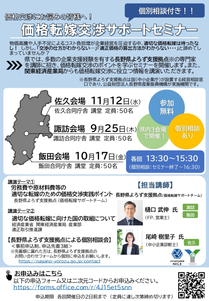 このたび長野県では、価格転嫁交渉のポイントを学べる対面セミナーを開催します。セミナー後は個別相談も可能です。