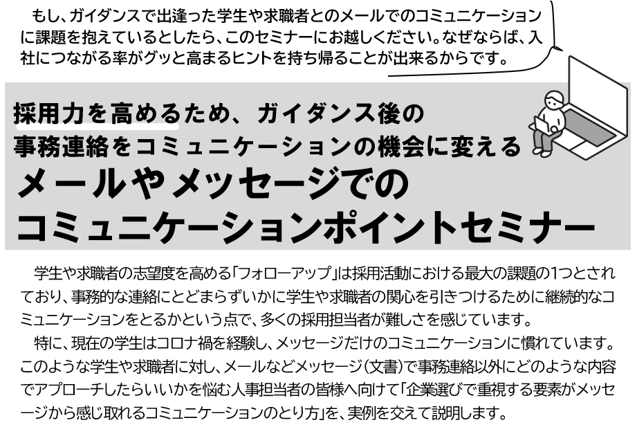 11/21|採用力向上セミナー メールやメッセージでのコミュニケーションポイントセミナー を開催します