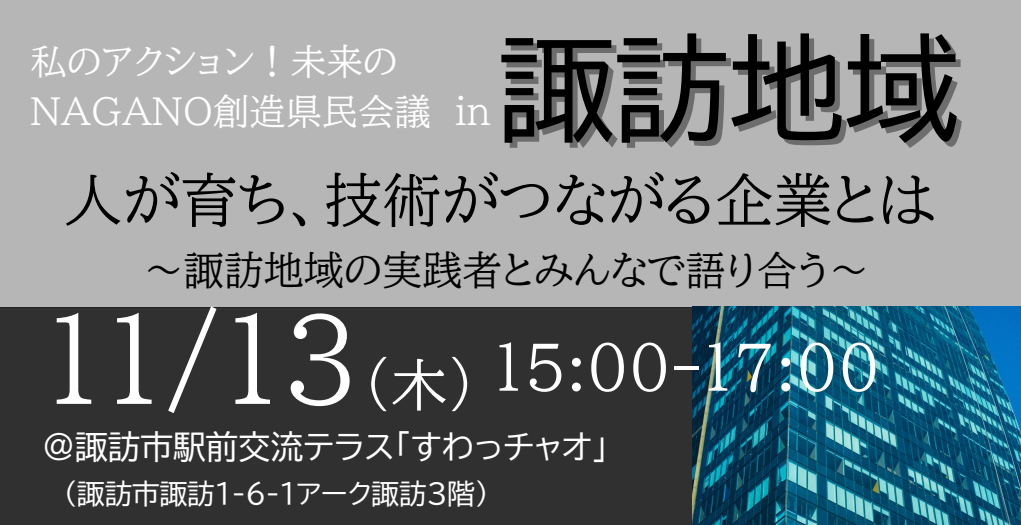 長野県では、長野県の未来を考え、行動につなげるために県内各地を巡る「県民会議キャラバン」を開催しています。第6弾は、「ものづくり」が盛んな諏訪地域で、人口減少が進む中でも「人が育ち、技術がつながる」ために必要なことを業種や世代を超えたみんなで考えます。対話を通じて具体的な行動を起こすきっかけをつくる内容です。