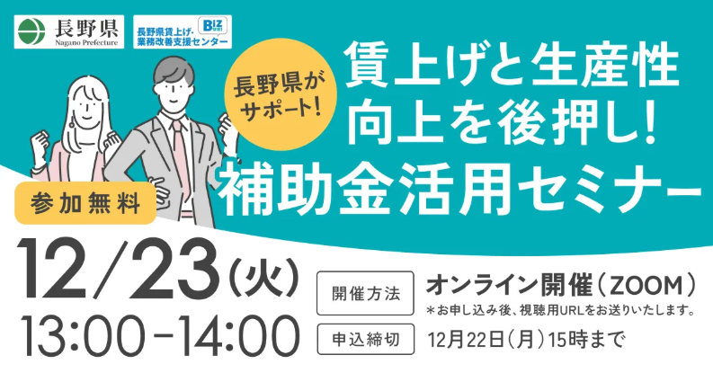 3. 1/14|長野県主催「賃上げと生産性向上を後押し!補助金活用セミナー」開催のお知らせ