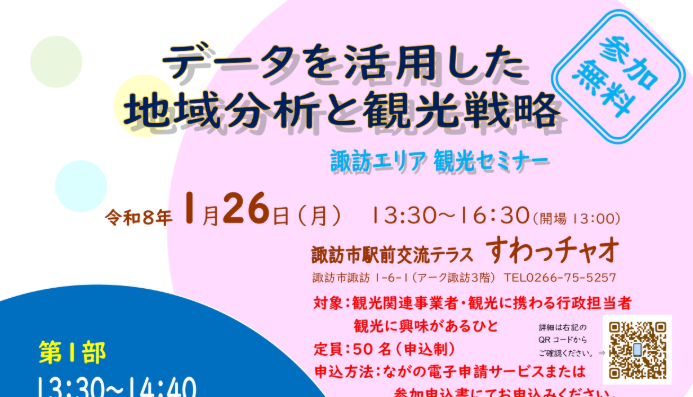 諏訪地方観光連盟が、一般の方でも簡単に活用が出来るようになった各種データを活用し「過去、現在」から「諏訪地域の観光の未来」の考え方を学ぶことができるセミナーを開催します。