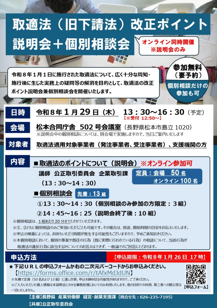 令和8年1月1日より施行された中小受託取引適正化法(取適法/旧下請法)について、長野県では施行後に生じた実務上の疑問などの解消を目的に、改正ポイントの説明会を開催します。オンラインも同時開催します。