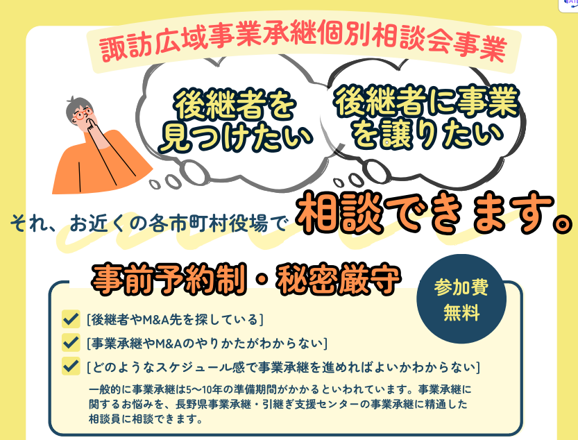 :026-219-3825 長野県事業承継・引継ぎ支援センターに電話をしてください。「茅野市役所で開催される事業承継相談の件で電話しています」とお伝え下さい。
