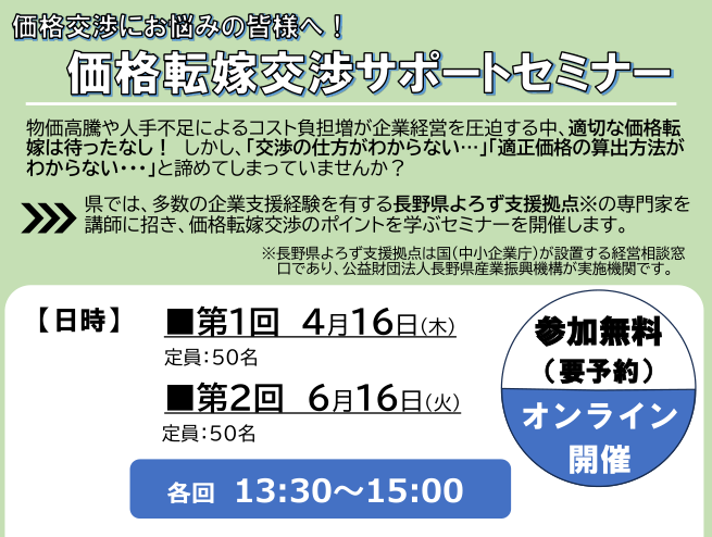 3. 4/16・6/16|「価格転嫁交渉サポートセミナー(長野県主催)」開催のお知らせ