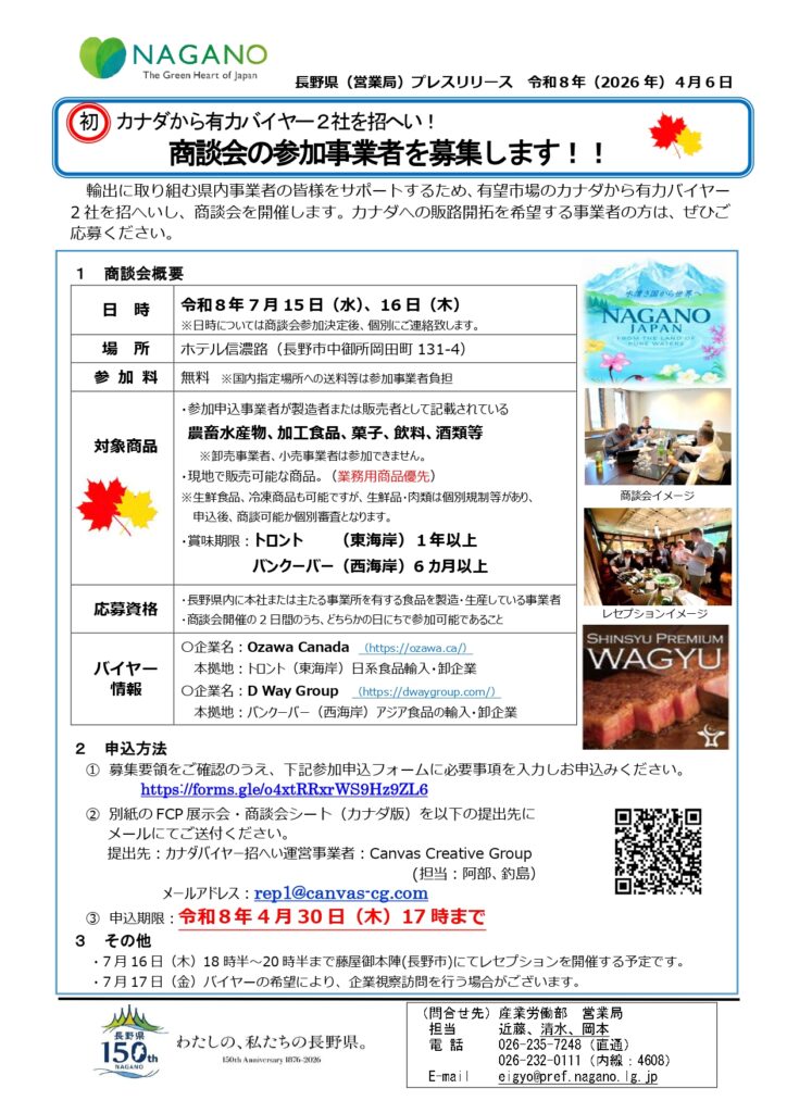 長野県では、輸出に取り組む事業者を支援するため、有望市場のカナダから有力バイヤーを招聘して商談会を開催します。カナダへの販路開拓を希望する事業者はぜひご応募ください。