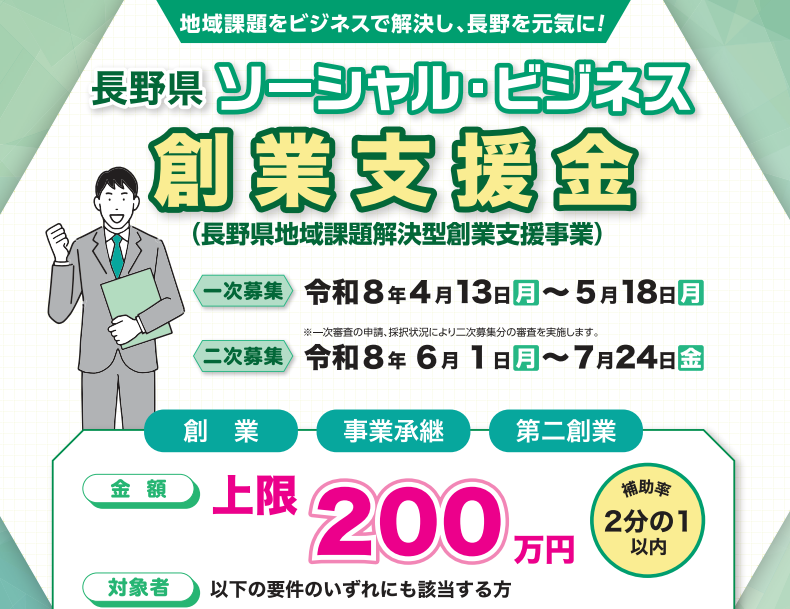 地域の課題をビジネスの手法で解決するソーシャル・イノベーションによる創業を進するため、創業に要する経費を助成す「ソーシャル・ビジネス創業支援金」の令和8年度の公募を開始します。
