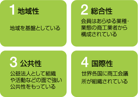 商工会議所は、①地域性・②総合性・③公共性・④国際性の4つの大きな特徴を持っています。