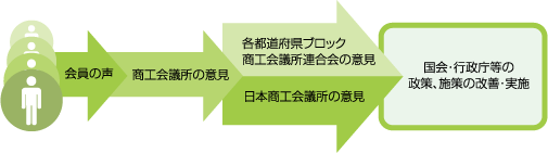 また、全国各地の商工会議所は約155万人の会員を擁しており、一人ひとりの意見は小さくとも、商工会議所が皆さんの意見をとりまとめ「組織としての意見」として、国や行政に提言することで行政を動かす力になります。
