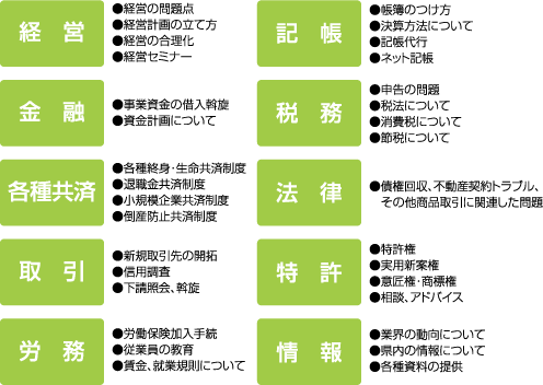 事業を行っていると、金融や税務、労務、経理など様々な問題に直面します。諏訪商工会議所では「経営指導員」を配置し各種様々な相談に応じていますので、お気軽にお申し出ください。相談は無料です。(専門家へおつなぎする場合があります。専門家によっては有料となる場合があります。)